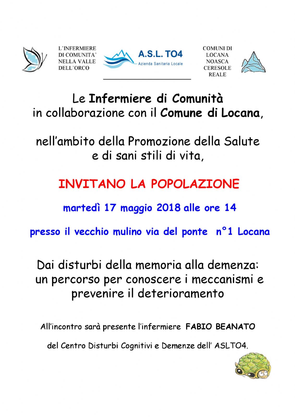 All’incontro sarà presente l’infermiere FABIO BEANATO del Centro Disturbi Cognitivi e Demenze dell’ ASLTO4.