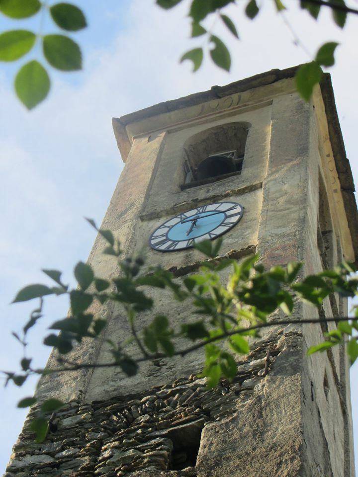 La torre campanaria, di impianto planimetico quadrato, sorge isolata dall'edificio della cappella ma accostato al lato di un edificio privato. La sua realizzazione è tradizionale: pietra locale a spacco, a vista nella parte inferiore ed intonacata rustica nella porzione superiore. Un muro a scarpa intonacato, costruito fino alla metà circa dell'altezza complessiva del campanile, funge senza dubbio da consolidamento per la struttura. La porzione più alta del campanile ospita il castello delle campane ed è aperto su tutte e quattro i lati con aperture rettangolari al di sotto delle quali, su un lato, è posizionato l'orologio. Sotto la copertura, a quattro falde realizzate in 'lose', il cornicione si presenta in cemento e reca la data 1821.