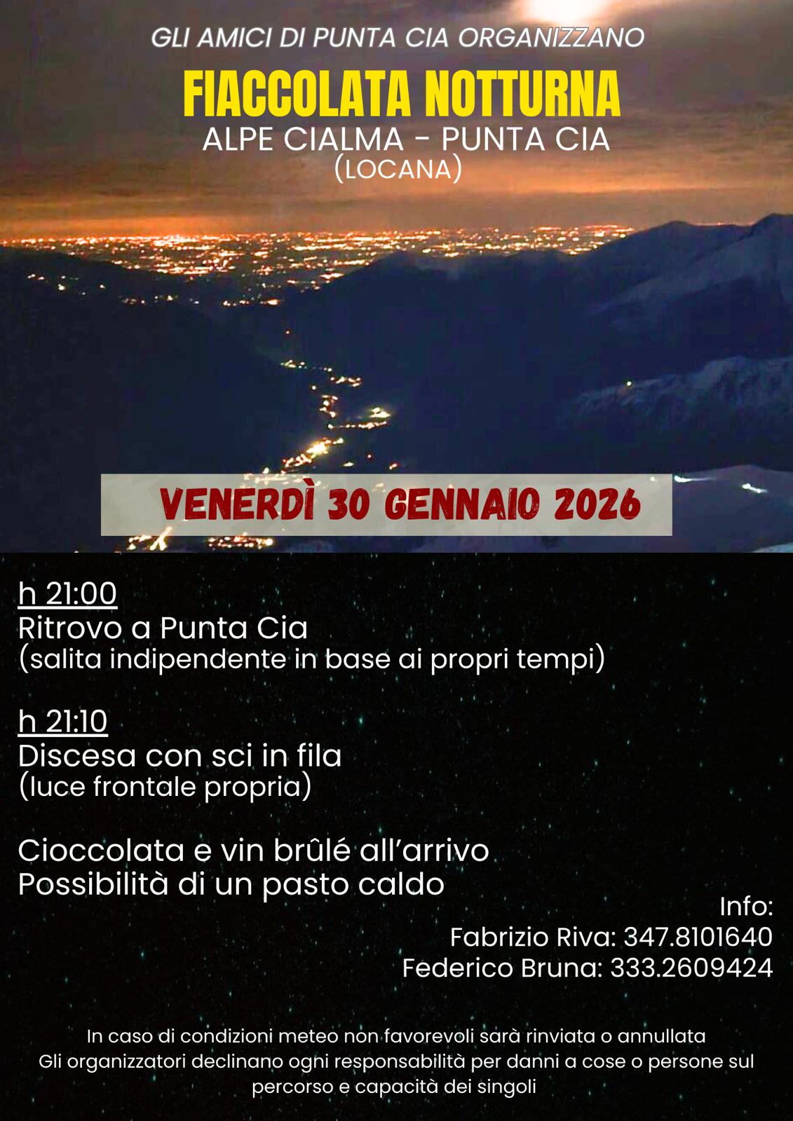 Venerdì 30 gennaio 2026 vivi un’esperienza indimenticabile a locana, all’alpe cialma: una suggestiva fiaccolata notturna sugli sci da punta cia, sotto le stelle e la magia della luna piena.