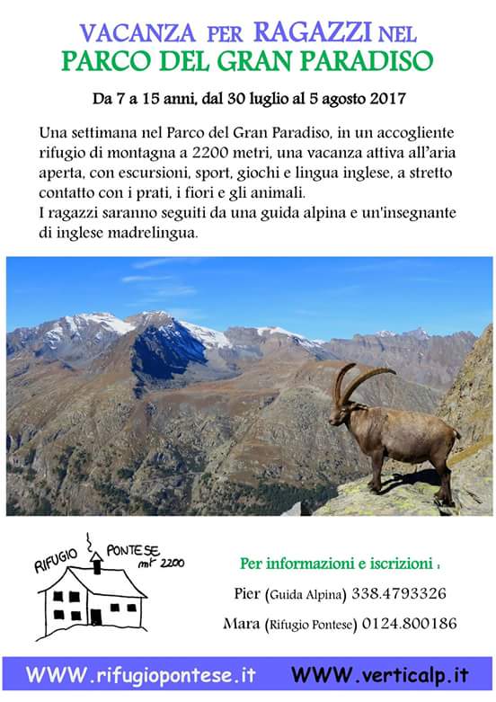 Una settimana nel Parco del Gran Paradiso, in un accogliente rifugio di montagna a 2200 metri, una vacanza attiva all'aria aperta, con escursioni, sport, giochi e lingua inglese, a stretto contatto con i prati, i fiori e gli animali.
