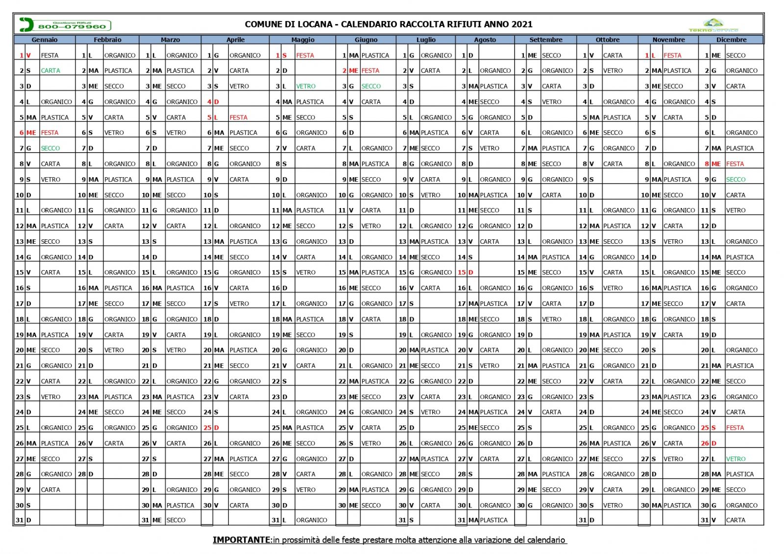 Calendario 2021 Raccolta rifiuti Locana