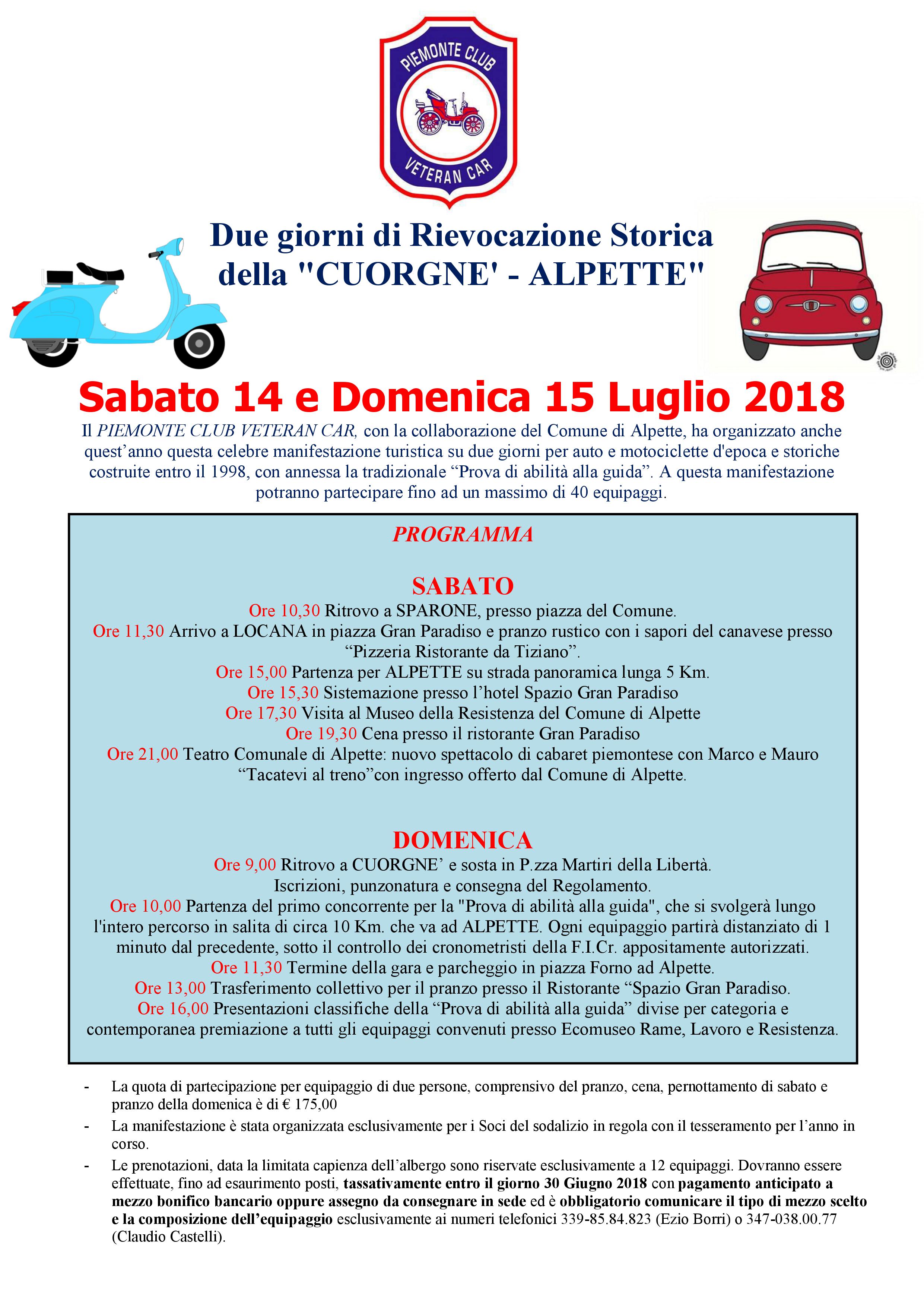 Il PIEMONTE CLUB VETERAN CAR, con la collaborazione del Comune di Alpette, ha organizzato anche quest’anno questa celebre manifestazione turistica su due giorni per auto e motociclette d'epoca e storiche costruite entro il 1998, con annessa la tradizionale “Prova di abilità alla guida”. A questa manifestazione potranno partecipare fino ad un massimo di 40 equipaggi.