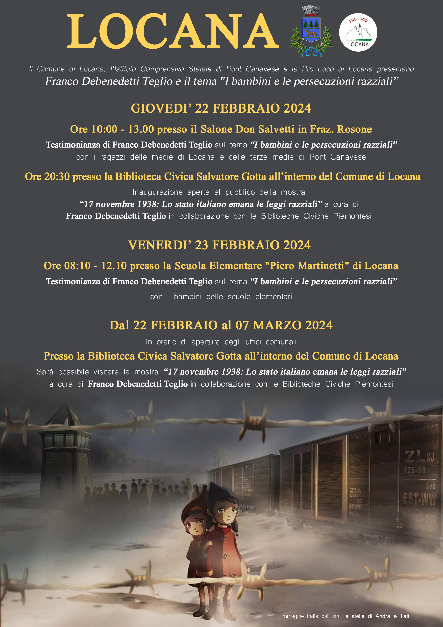 Presso la Biblioteca Civica Salvatore Gotta all'interno del Comune di Locana, sarà possibile visitare la mostra "17 novembre 1938: Lo stato italiano emana le leggi razziali" a cura di Franco Debenedetti Teglio in collaborazione con le Biblioteche Civiche Piemontesi