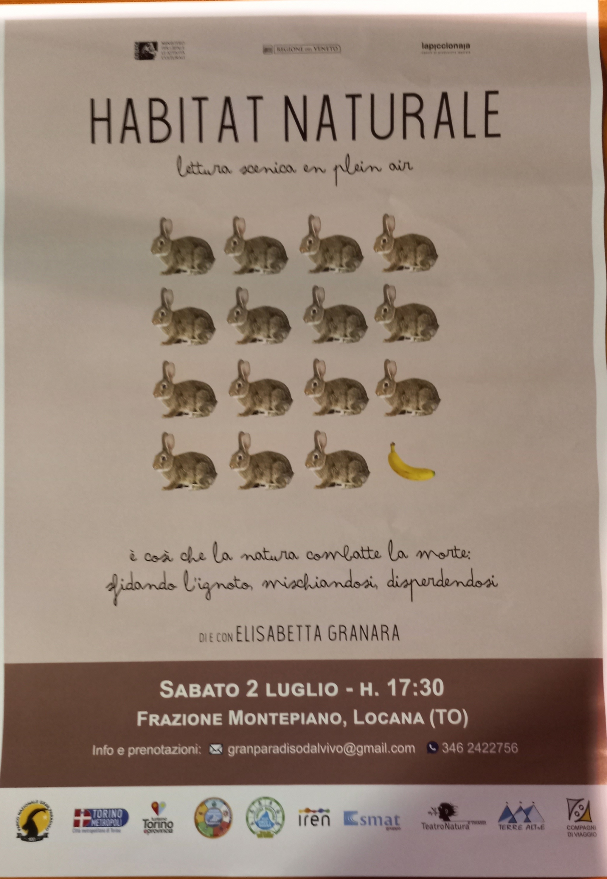 Sabato 2 luglio alle ore 17.30 il Festival si sposta a Frazione Montepiano di Locana (in caso di pioggia presso Anfiteatro di Piazza Gran Paradiso - Casermette) per lo spettacolo Habitat Naturale del Gruppo Teatro Campestre (dal Veneto) di e con Elisabetta Granara prodotto da Il Gruppo di Teatro Campestre, La piccionaia-Centro di Produzione Teatrale B.Motion Operaestate Festival Veneto, in collaborazione con Fondazione Luzzati-Teatro della Tosse. Habitat Naturale è uno spettacolo teatrale ambientato in un immaginario Museo di Storia Naturale e racconta di quando una nuova presenza ha sconvolto la quiete della Direttrice e del Guardiano. Uno spettacolo che è un thriller da museo. Una storia che sa di formalina. Un punto di vista biologico sul futuro intorno a tre parole chiave: dispersione, adattamento, evoluzione. «La dispersione è un fenomeno biologico fondamentale per tutti gli organismi viventi. Attraverso i più vari adattamenti piante, animali, funghi, protisti, batteri e virus sfidano l’ignoto per conquistare nuovi spazi, nuove occasioni di vita. La dispersione spesso assicura la sopravvivenza di una specie, perché se questa può propagarsi avrà più possibilità di sopravvivere ai cambiamenti climatici o ambientali locali, a epidemie e catastrofi naturali. La dispersione è quasi sempre alla base della formazione stessa di una nuova specie» Marco Di Domenico, Clandestini. Animali e piante senza permesso di soggiorno. Due personaggi, una sola voce immersa in una natura viva, per raccontare una storia che si sviluppa tra i corridoi di una grande natura morta. Anche se siamo all’aperto, siamo rimasti chiusi dentro con le nostre paure. Ad aspettarci fuori, invece, c’è il futuro: una bestia sconosciuta, una specie in via di evoluzione. In un periodo storico in cui le migrazioni ci mettono in crisi con la loro complessità, Elisabetta Granara prova a cercare delle risposte nella Natura e conduce gli spettatori lungo i corridoi immaginari di un Museo di Storia Naturale, qui fatto di alberi e montagne, per ripercorrere con loro lo stupore del suo incontro di profana con la Biologia e l’Ecologia.