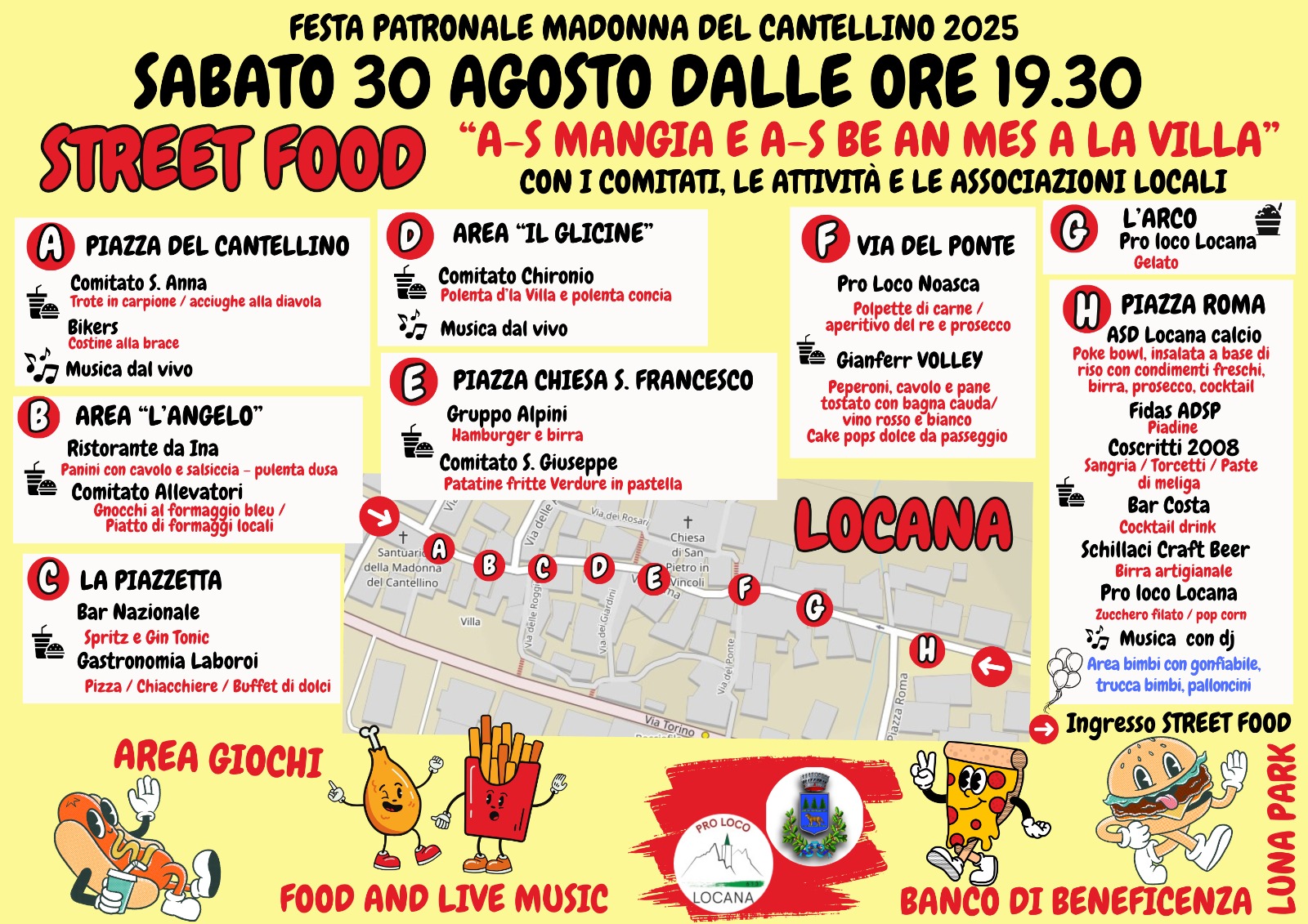 - Street Food “A-s Mangia E A-s Be An Mes A La Villa” con i Comitati, le Attività e le Associazioni Locali. Intrattenimento con Musica dal Vivo E Dj, Area Bimbi, Balli e Divertimento.