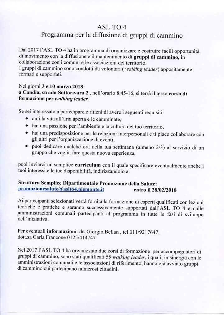 a Candia, strada Sottorivara 2 , nell’orario 8.45-16, si terrà il terzo corso di formazione per walking leader.