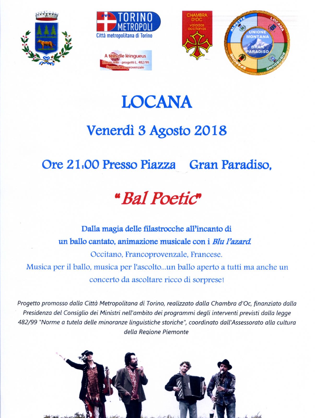 Progetto promosso dalla Città Metropolitana di Torino, realizzato dalla Chambra d'Oc, finanziato dalla Presidenza del Consiglio dei Ministri nell'ambito dei programmi degli interventi previsti dalla legge 482/99 "Norme a tutela delle minoranze linguistiche storiche", coordinato dall'Assessorato alla cultura della Regione Piemonte