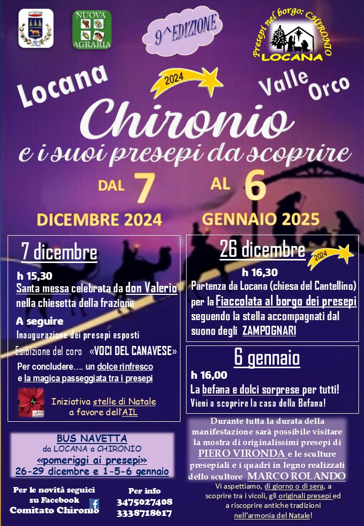 h. 16.30 Partenza da Locana (Chiesa del Cantellino) per la Fiaccolata al borgo dei presepi seguendo la stella accompagnati dal suono degli Zampognari