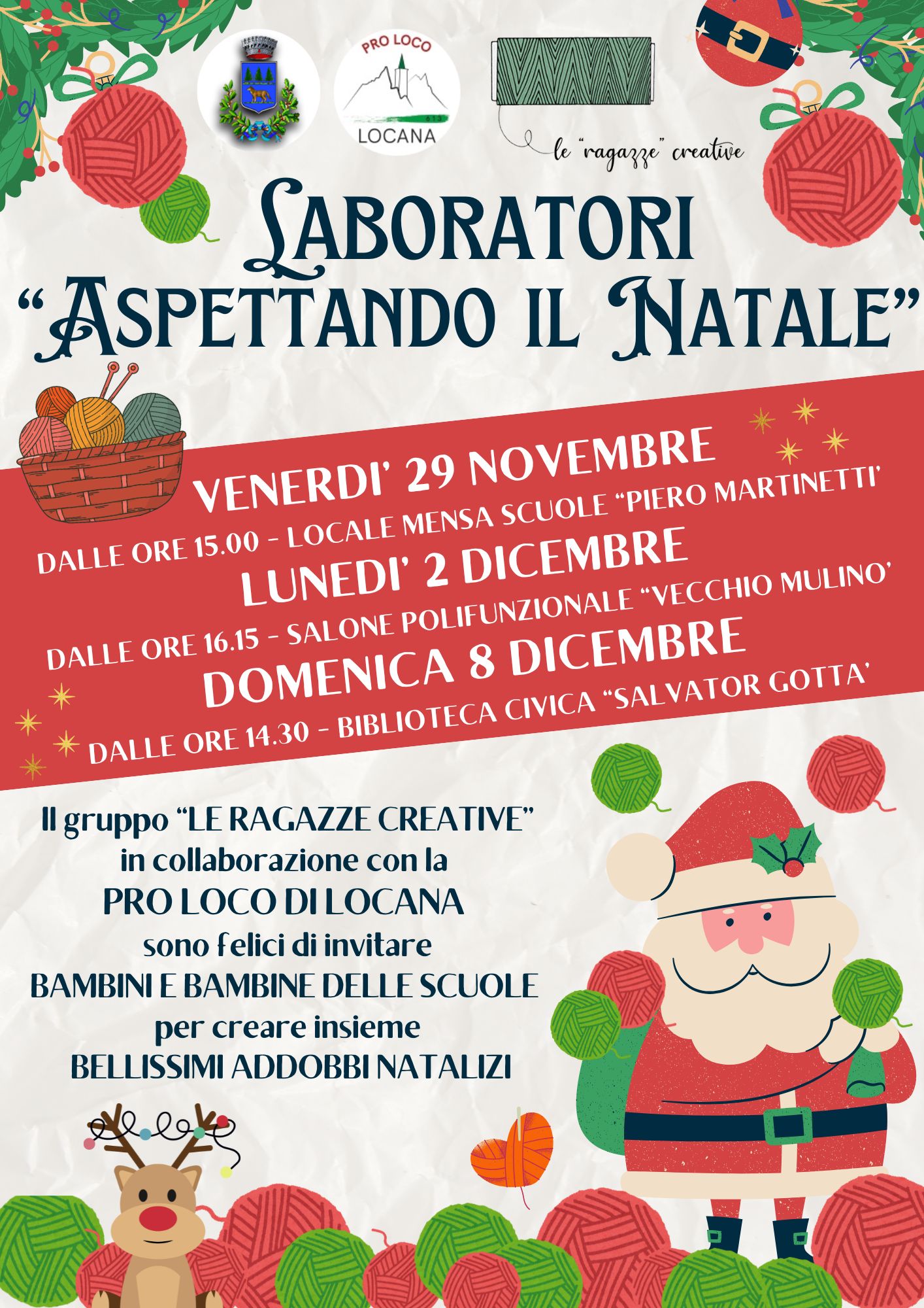 Il gruppo “Le ragazze creative” in collaborazione con la Pro Loco Locana sono felici di invitare bambini e bambine delle scuole per creare insieme BELLISSIMI ADDOBBI NATALIZI. 🎄🎅🏻