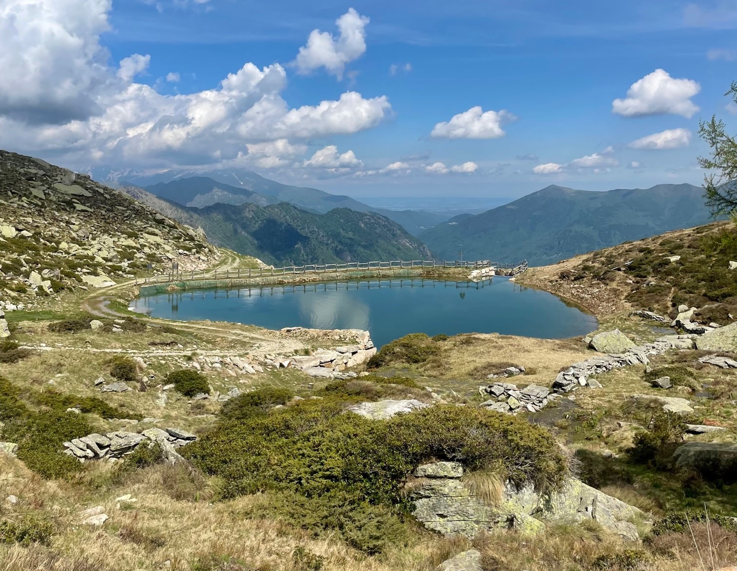 Imboccare la strada interpoderale e seguirla, prendendo il bivio che conduce all'arrivo della seggiovia. Di lì, proseguire nel pascolo di fronte alla stazione di monte e imboccare il sentiero sulla destra verso i ruderi di vecchie baite. Seguire il sentiero ben visibile fino al lago. Prestare attenzione alla parte di sentiero che segue i ruderi, poiché stretta, ma dotata di fune in acciaio a cui aggrapparsi. Si può rientrare percorrendo la strada interpoderale che scende fino al Rifugio. Percorso adatto a tutti, anche ai bambini.